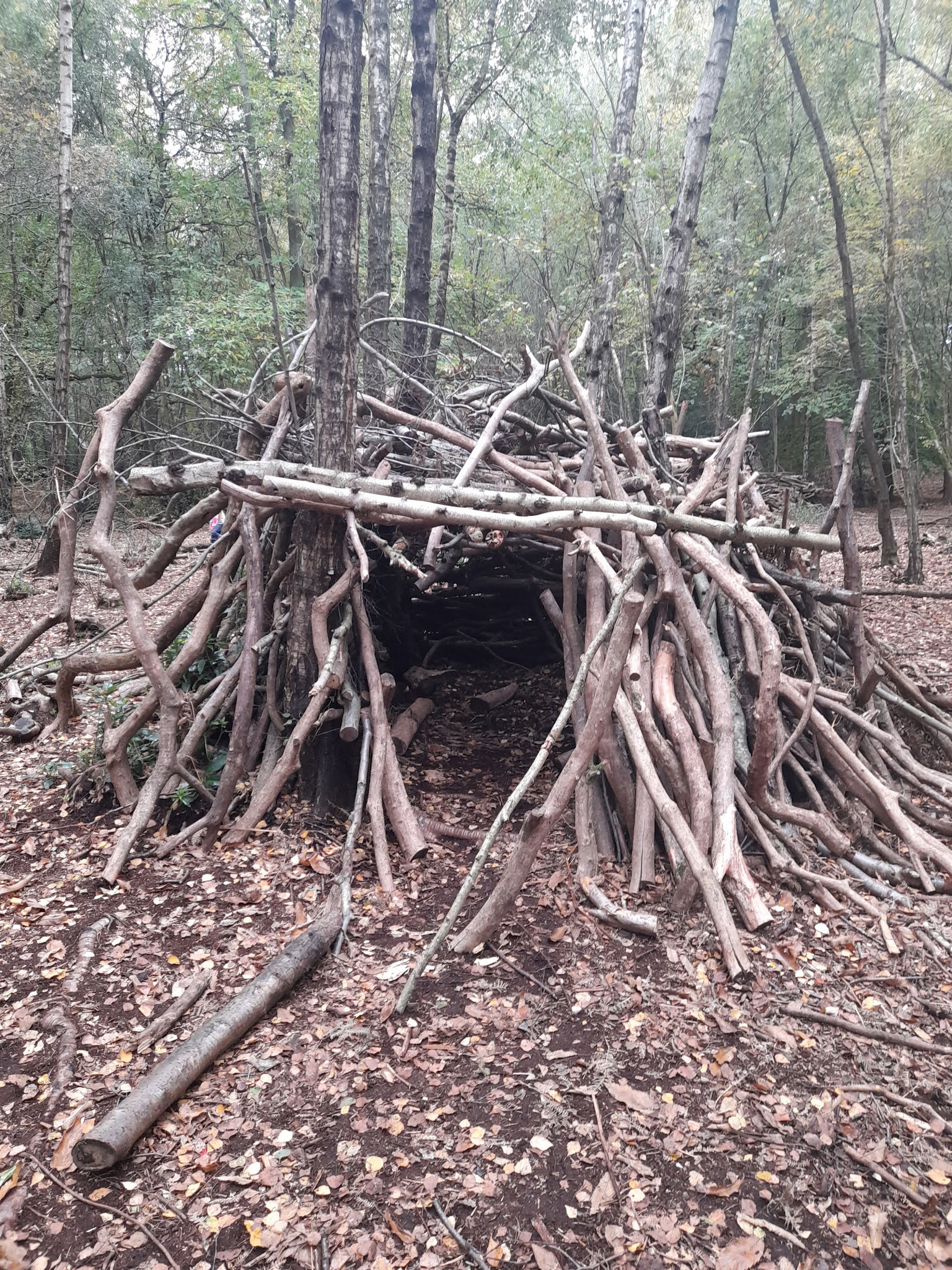 Depending on what woodland materials are available, one can build thicker walls either using more sticks and branches or bracken and leaves.